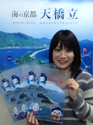 The latest is a plastic file folder called "Amanohashidate x Yuru-kyara Clear File." It's really cute with the images of three local mascots: Nami-chan from Miyazu, Mamekkomai-chan from Yosano, and Funa-yan from Ine.